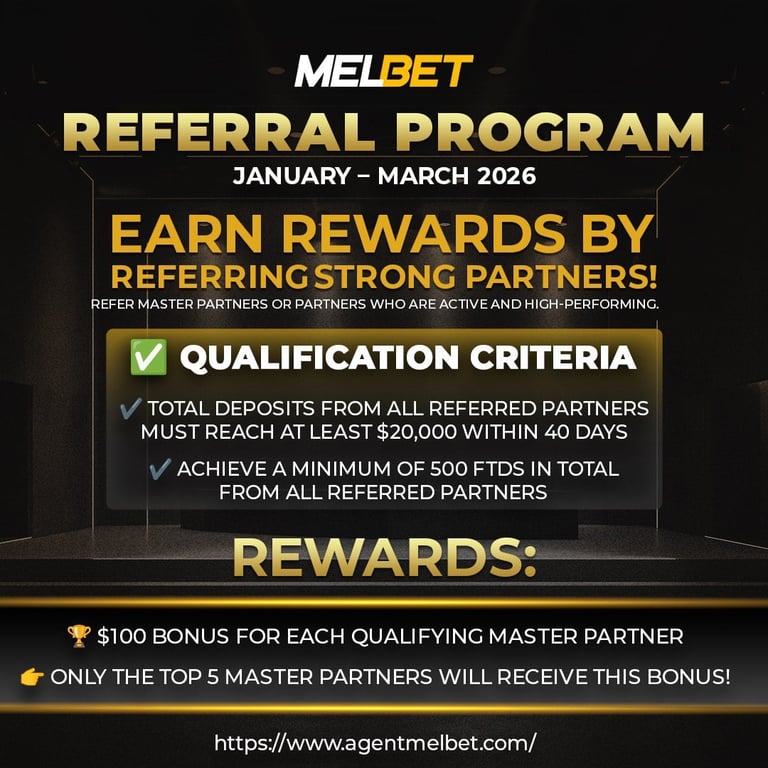 As 2026 begins, growing a strong and active partner network remains a key focus for many digital partners. The Melbet Partner Referral Program for January to March 2026 is designed to recognize partners who help expand the network by introducing other capable and high-performing partners.This referral initiative highlights the importance of quality partnerships, not just volume. Partners are encouraged to refer individuals or teams who are active, compliant, and performance-driven. Qualification is based on verified activity within a defined time period, ensuring the program remains structured, transparent, and results-oriented.